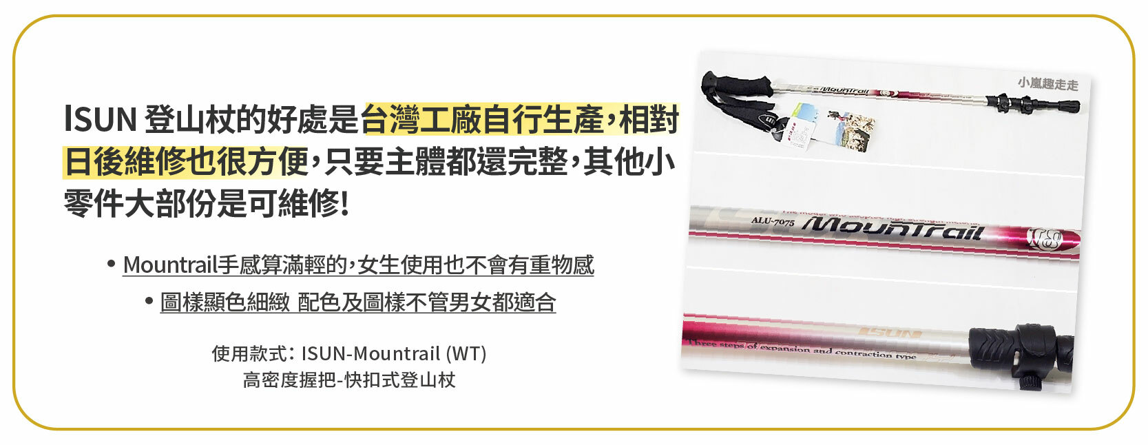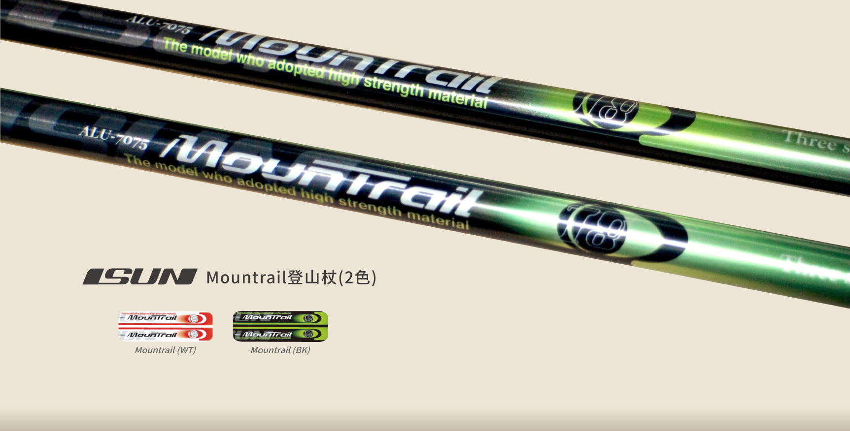 Mountrail 和 Grid 都是搭配相同的規格喔!所以它們同樣都有上述介紹的四種規格可以選擇。宜山商品型號主要以杖身圖樣為命名標準,因此兩者只有在杖身上的圖樣設計是不一樣,其他搭配都一樣。Mountrail有兩種顏色設計;而Grid有三種顏色設計。