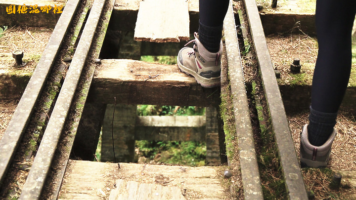 小心走過高架鐵軌橋,使用登山杖來增加穩定性。