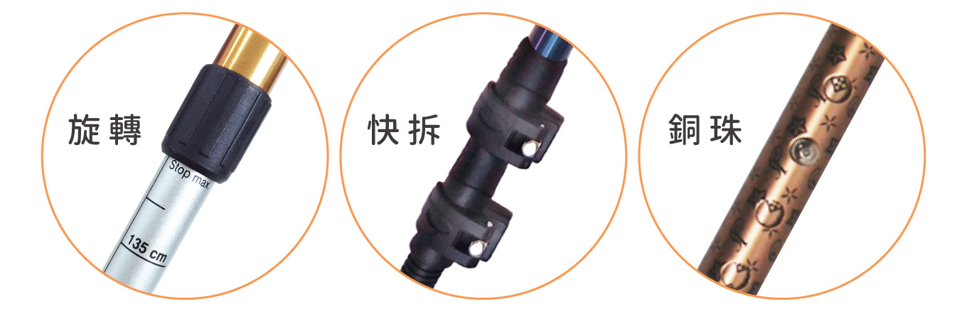 ・銅珠系統:更輕鬆不費力地調整長度,多使用於銀髮族手杖,提供年長者日常行走可方便自行調節。銅珠系統為卡扣式固定,因為"較好調整" 適合用於日常休閒使用。不建議使用在易有崎嶇變化多的地形,因此較不適用長途登山活動。