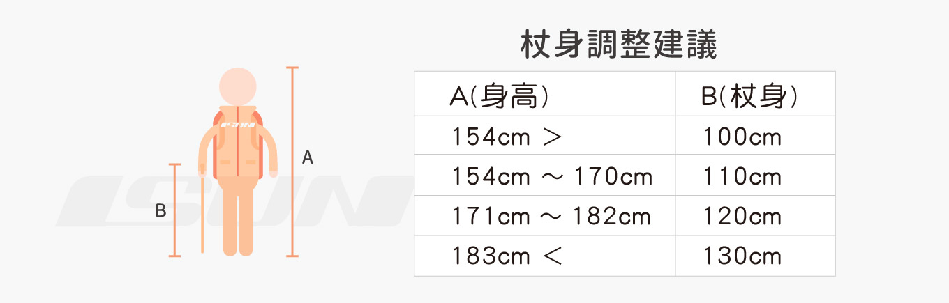 ISUN登山杖的使用長度落在100~140cm 適用範圍廣,通用東方大眾使用者。