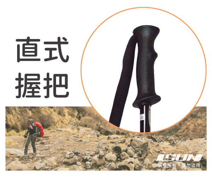 ・登山杖:戶外登山專用工具,主要為「直式握把」,登山杖協助上下坡時減輕四肢肌肉的負擔,適用於各種地形保持平衡與支撐。