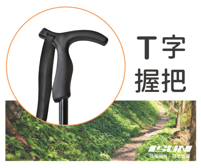 T字拐杖型握把(亦稱7字/L型握把)適合平緩坡地健走使用。T把有兩種握法,可使用一般握取拐杖的方式、或握在下方延伸的直把部分。小提醒:長時間於戶外健行不建議選擇T把,因腕帶穿戴上會較為不便、握太久時手腕會較不適應。T把較適合用在短行程的郊山健行使用。