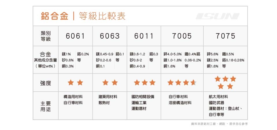 特別強調一點,不同成分比例的鋁合金,抗拉性與堅固程度皆符合其各個等級的標準,而每項等級的鋁合金都有其適合的用途(如圖提供各位參考)。本篇我們主要提出登山杖製造過程中的起源與方式,透過比較鋁合金等級差異、品質用料優劣供大眾參考,至於該如何判斷其優缺,這邊還是請大家購買有品質認證與材料測試的鋁製登山杖,才能確保使用上的安全。