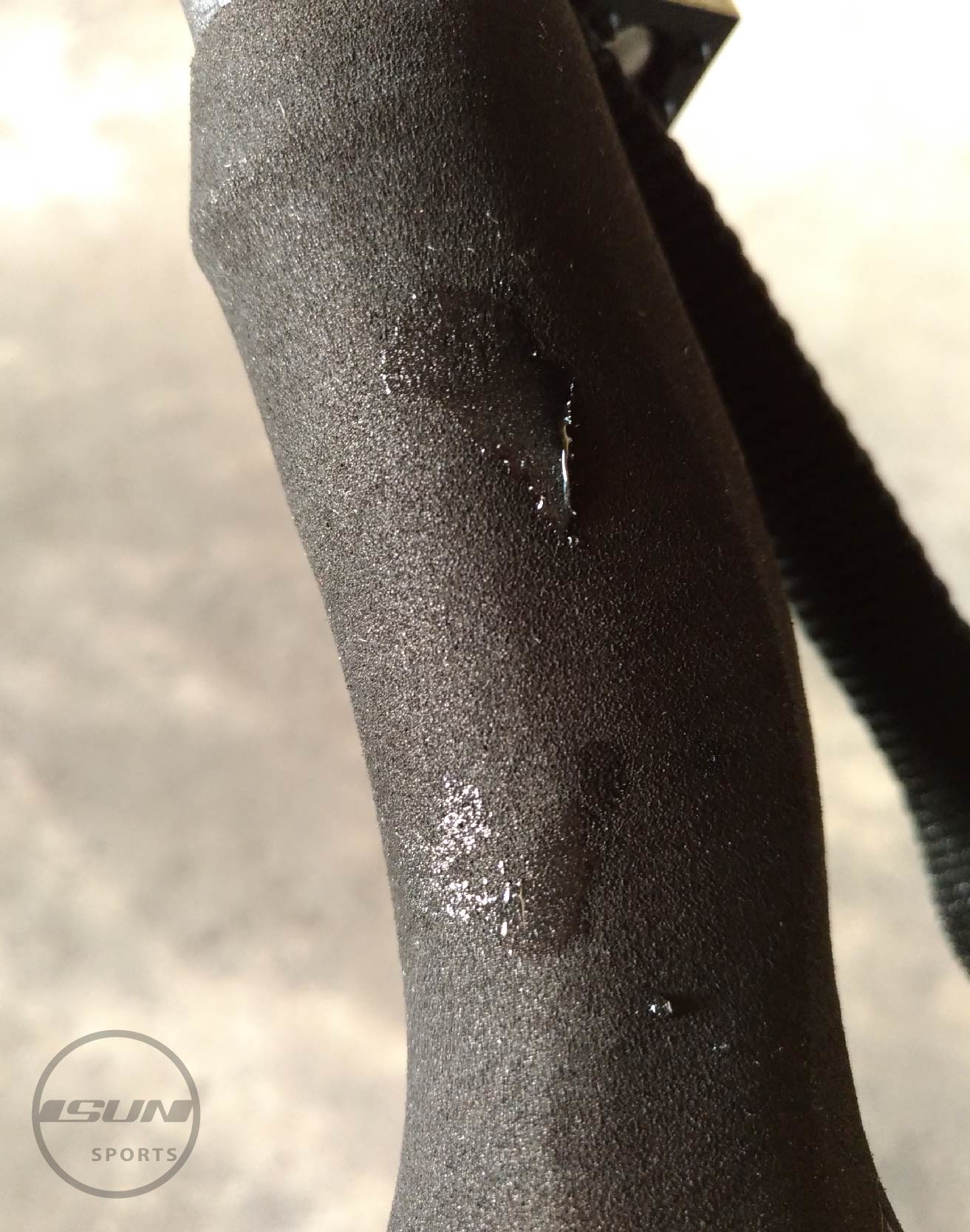 因為是高密度的關係,握把具有防潑水效果,水會在表面形成水珠,不需擔心濕透整個握把。但其表面紋理可乘載一些些水份,若有流手汗使用時也不怕滑!