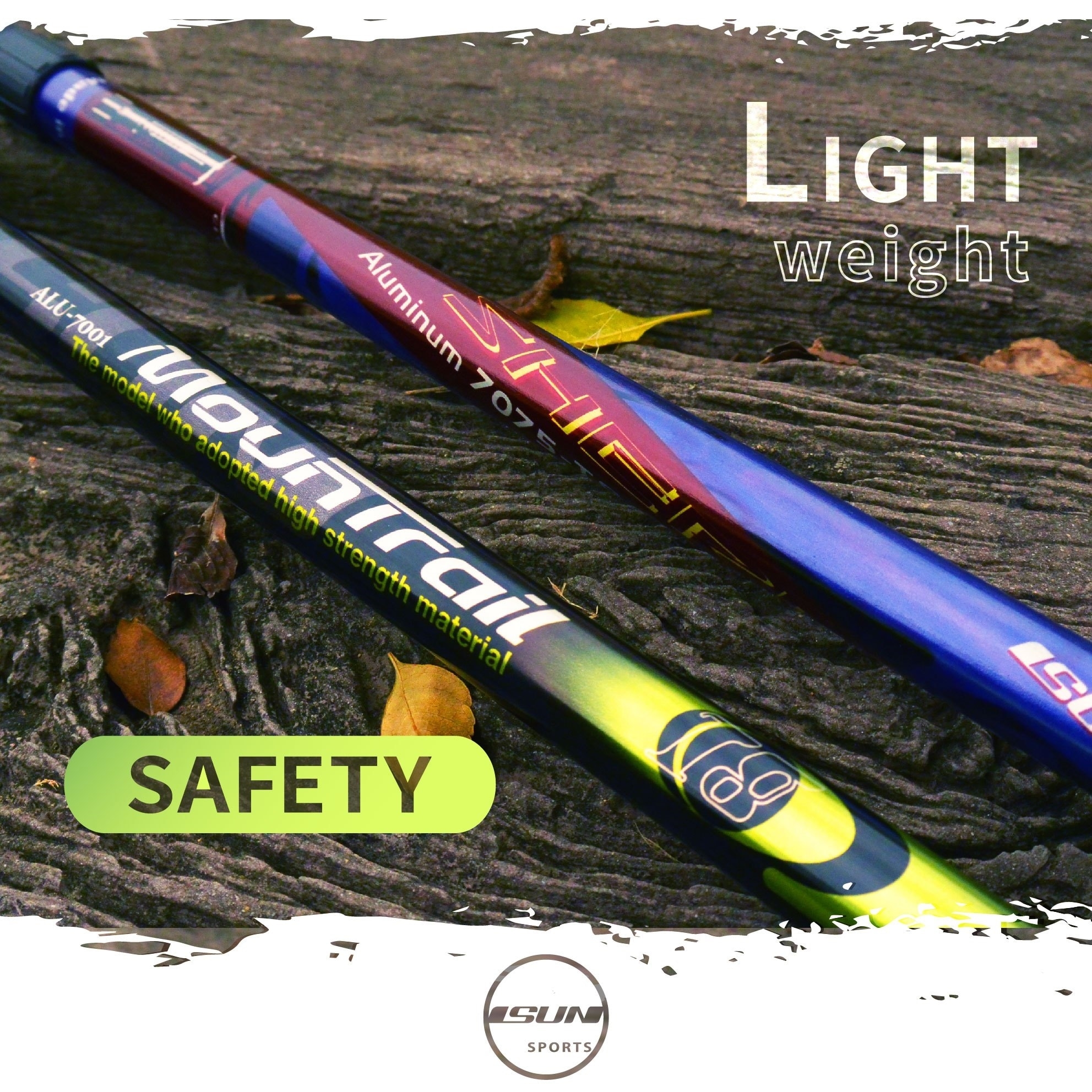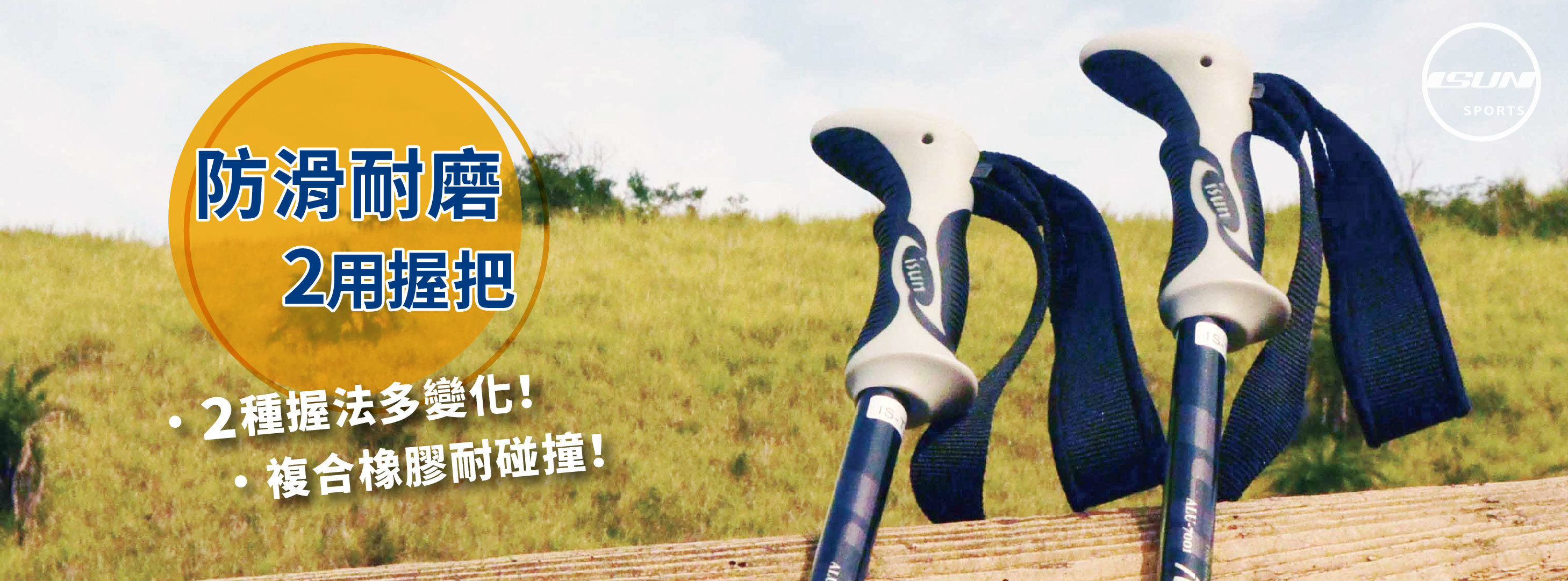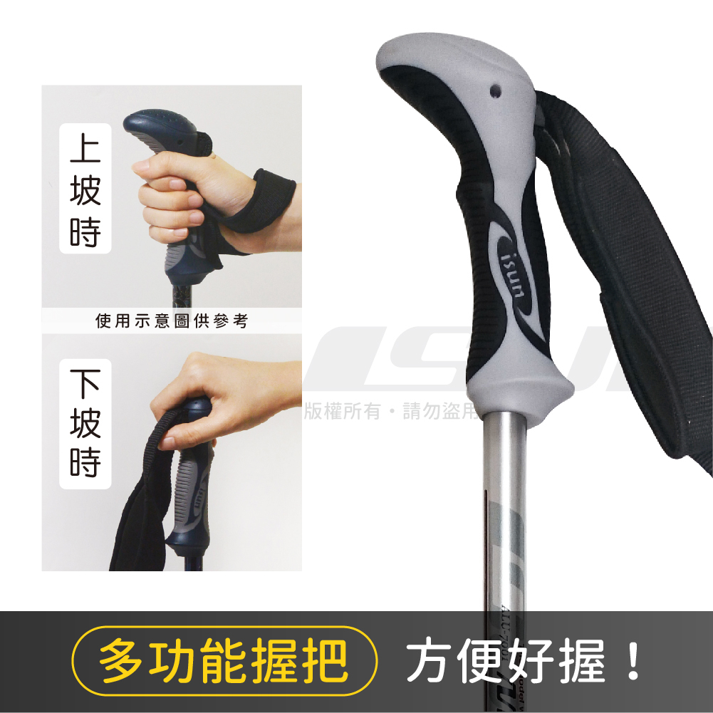 宜山ISUN必須強調!我們材料取得皆由台灣所製造的「複合式橡膠材質」,而橡膠有著耐磨、耐撞特性,適合應用在輪胎、鞋底、腳墊等任何需要耐得住與地面摩擦的材料。選用這款高耐用度的兩用握把登山杖,讓你在戶外體驗時更耐久、不怕碰撞。