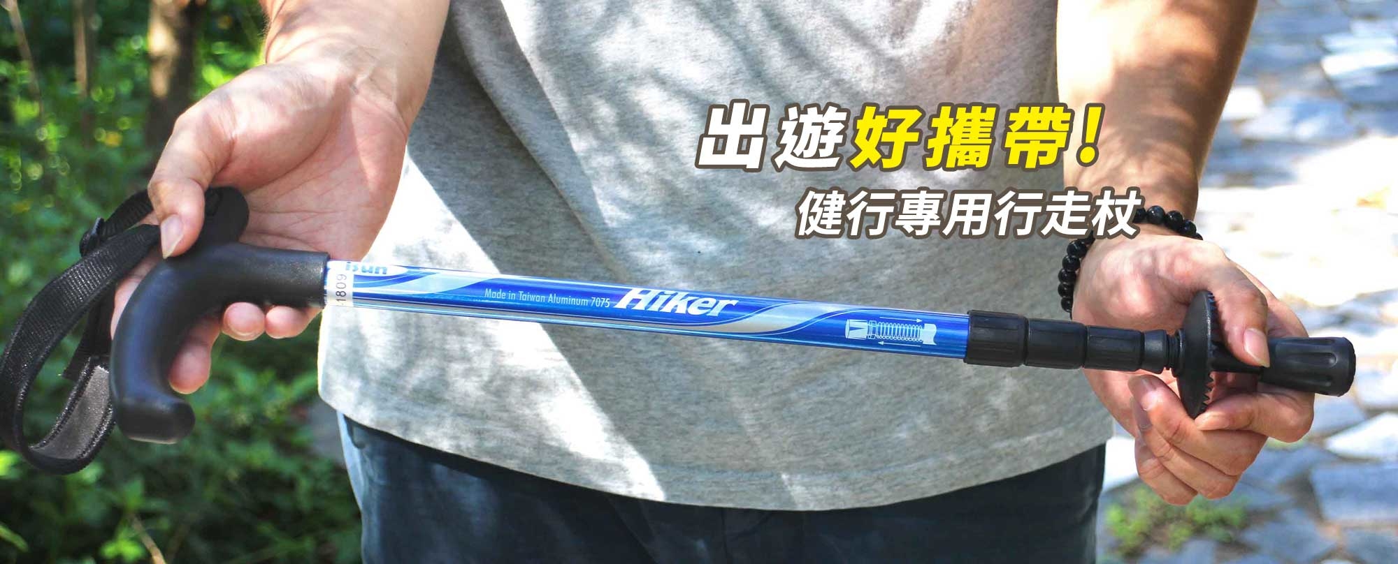 「行走杖」是為平時喜歡散步、常常到淺山健行的朋友們開發設計,好攜帶、高強度是它的特色。適合身高145cm~身高175cm的大眾使用,伸縮式杖身最短可收納到47cm出門更好攜帶,而且重量比2台智慧型手機還輕。