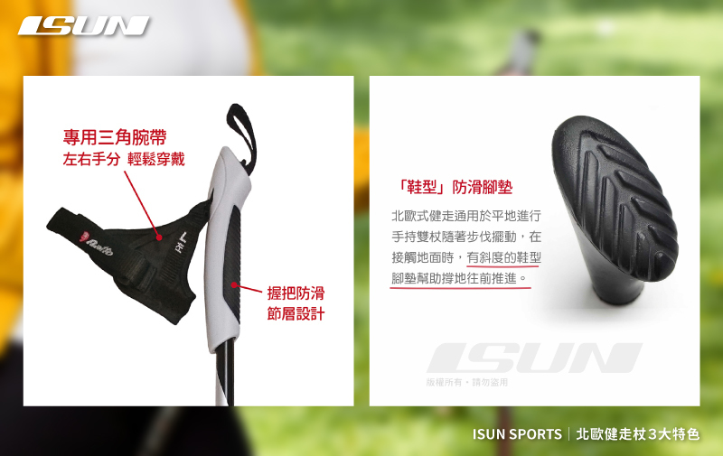 (2) 專利設計三角腕帶:分別製成左手、右手的專用腕帶,相較於登山杖腕帶,其專用特殊套環設計腕帶,使行走時更能延伸手臂的力量,由雙手握取杖身來支撐地面,透過槓桿的力量將身體向前推進。選用尼奧普林-潛水衣布料材質,具彈性佳、防水防滑特性。